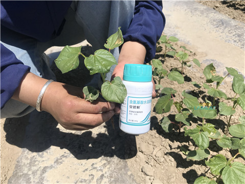 筆者走訪新疆市場發(fā)現(xiàn)大家討論說,在當?shù)厮麄儗τ诔輨埩粲忻钫?,?jīng)交談發(fā)現(xiàn),大家普遍使用一個叫做安碧解的產(chǎn)品,說效果特別好。后來與一位種植戶聊完才發(fā)現(xiàn),安碧解是拉姆拉水溶肥公司的拳頭產(chǎn)品,專門針對除草劑藥害研發(fā),目前在棉花應用效果非常好,與封閉除草劑一起復配使用,除草迅速又環(huán)保。